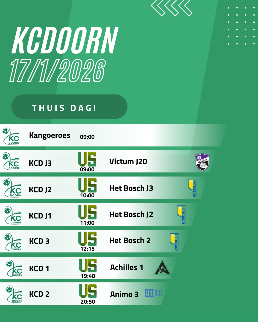 Deze zaterdag hebben we weer de eerste thuisdag van het nieuwe jaar! Er staat een drukke planning op het programma, waarin de kangoeroes en de J3 een uurtje eerder spelen dan we gewend zijn. Onze jongste spelers zijn er dus alweer vroeg bij. Daarna volgen de J2, J1 en KCD 3. Een mooie invulling voor je zaterdagochtend dus 😉 Na een korte middagbreak gaan we om 19:40 weer van start met onze KCD 1 en sluiten we deze thuisdag af met een knaller van KCD 2. De vroege teams én de late teams kunnen alle support gebruiken, so…. be there!