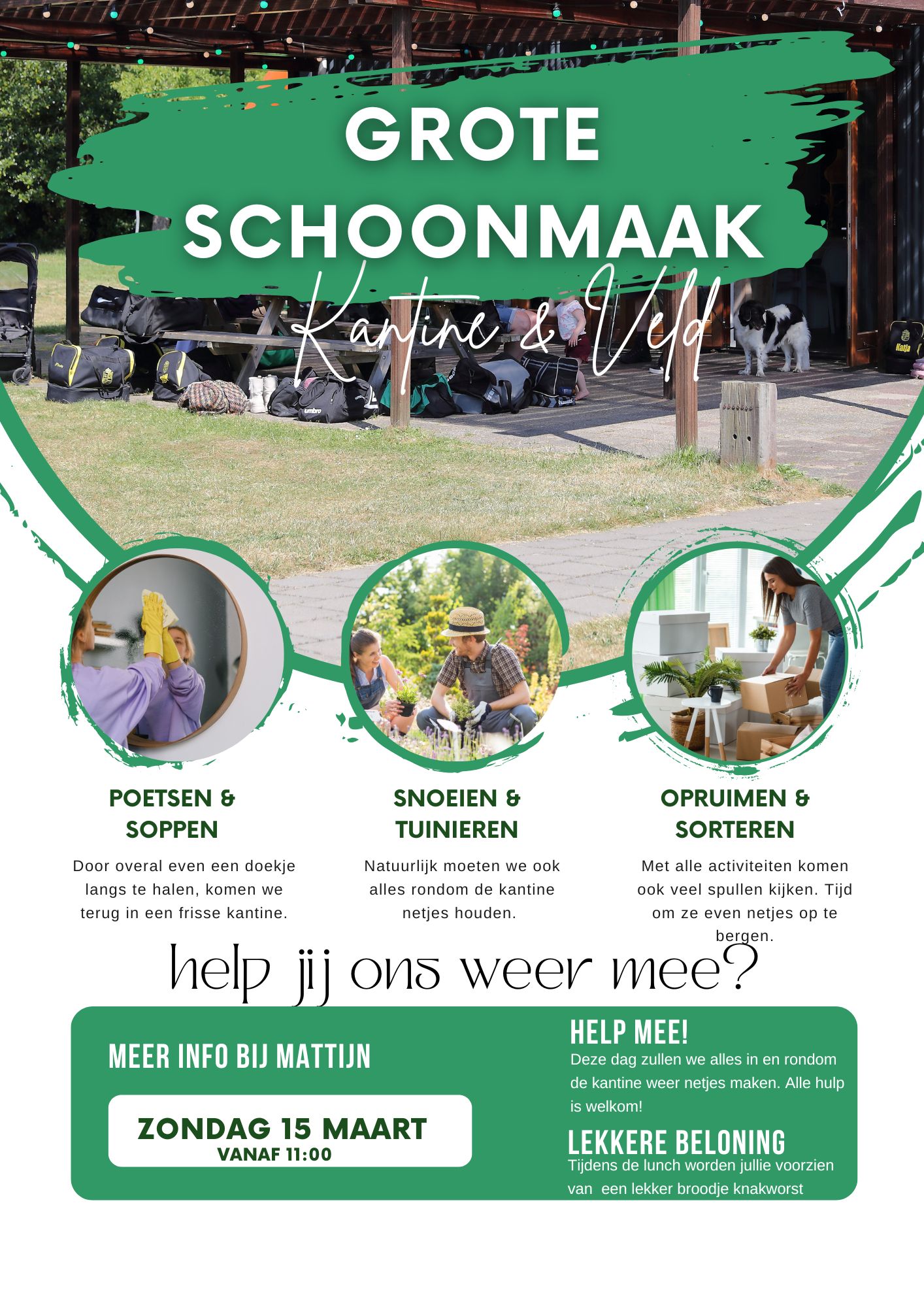 Zondag 15 maart is het weer tijd voor de grote schoonmaak. Zoals ieder jaar gaan we samen de kantine goed schoonmaken, voordat we er weer lang gebruik van gaan maken komende korfbalseizoenen! En hiervoor hebben we jouw hulp nodig. Naast dat je de club heel erg helpt als je komt, is het ook een enorm gezellige middag. Voor het eerst weer met een grote groep in de kantine, muziekje erbij aan en als kers op de taart verzorgen we een lunch voor de harde werkers! Geniet van een broodje knakworst en draag jouw steentje bij.